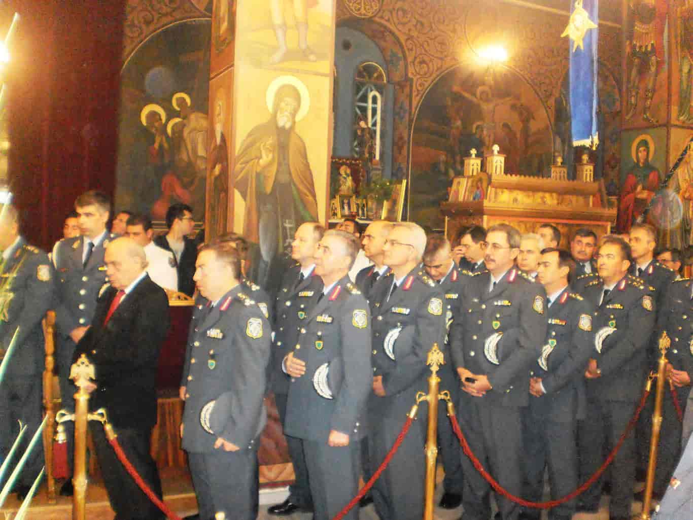 Τελέστηκε απόψε 19-10-2013  παραμονή της εορτής του Αγίου Αρτεμίου Μέγας Αρχιερατικός εσπερινός με αρτοκλασία, στον Ι.Ν. Παμμεγίστων Ταξιαρχών στον χώρο των πρώην  Σχολών της Ελληνικής Αστυνομίας. Χοροστάτησε ο Σεβασμιότατος Μητροπολίτης Πάρου & Νάξου κ.κ. Καλλίνικος μετά του Προϊσταμένου της Θρησκευτικής Υπηρεσίας Πανοσιολογιότατου κ.κ. Νεκταρίου Κιούλου. Παρέστησαν ο Γ.Γ. του Υπουργείου Προστασίας του Πολίτη κ. Ρογκάκος,  ο κ. Αρχηγός της Ελληνικής Αστυνομίας, ο κ. Υπαρχηγός, ο Γενικός Επιθεωρητής Νοτίου Ελλάδος, ανώτατοι και ανώτεροι αξιωματικοί και αντιπροσωπεία από τους εν ενεργεία αξιωματικούς και λοιπό προσωπικό, σύμφωνα με την εκδοθείσα από το Αρχηγείο σχετική Διαταγή και πρόγραμμα τελετής και πλήθος πιστών. Τον Σύνδεσμό μας εκπροσώπησε ο Γ.Γ. Κουτσοποδιώτης  Οδυσσεύς. Μετά την αρτοκλασία ακολούθησε περιφορά της εικόνας στον χώρο των πρώην σχολών. Τιμές απέδωσε άγημα δοκίμων Αξιωματικών της Σχολής Αξιωματικών της Ελληνικής Αστυνομίας.